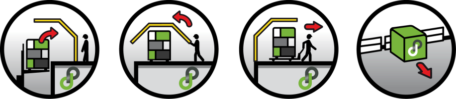 Het beweegbare gedeelte verplaatst zich over de pallets waardoor rechtstreeks contact met de lege ruimte “op hoogte” automatisch wordt vermeden.